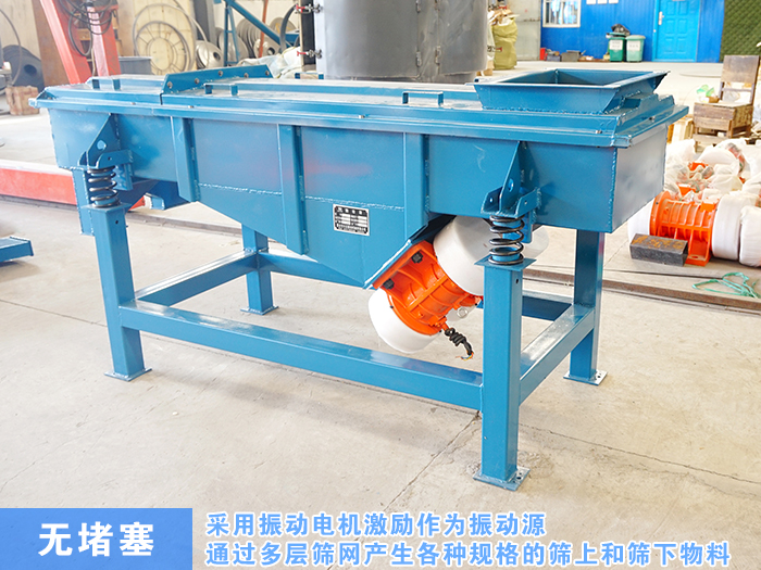 直線振動篩采用振動電機激勵作為振動源,使物料在篩網上拋起,同時直線前進。物料從進料器均勻進入篩選機進料口,通過多層篩網產生各種規(guī)格的篩上和篩下物料,分別從各自的出口排出,不存在堵塞現(xiàn)象,產量高。