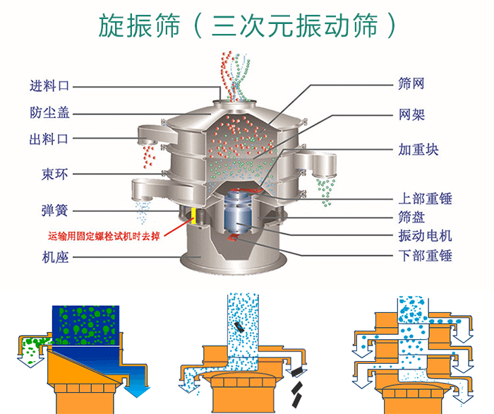 旋振篩又名(三次元振動(dòng)篩)的外形結(jié)構(gòu)可以分為:進(jìn)料口、防塵蓋、篩網(wǎng)、網(wǎng)架、出料口、束環(huán)、彈簧、篩盤和底座;