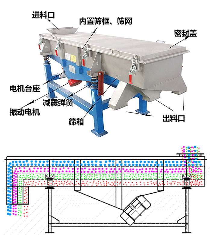 直線篩于直線振動(dòng)篩是一樣的產(chǎn)品其結(jié)構(gòu)可簡單分為:進(jìn)料口、篩機(jī)蓋、篩板、出料口、彈簧和電機(jī)。