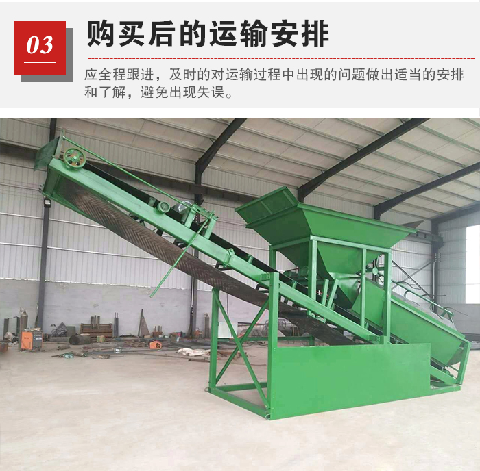 篩沙機(jī)在采購(gòu)?fù)戤吅?,廠家會(huì)在設(shè)備完成后進(jìn)行運(yùn)輸發(fā)貨,此時(shí),用戶應(yīng)全程跟進(jìn),及時(shí)的對(duì)運(yùn)輸過(guò)程中出現(xiàn)的問(wèn)題做出適當(dāng)?shù)陌才藕土私?,避免廠家出現(xiàn)失誤,出現(xiàn)小配件漏發(fā)等問(wèn)題。
