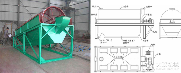 電機(jī)驅(qū)動(dòng)滾筒軸線作旋轉(zhuǎn)運(yùn)動(dòng),減速機(jī)調(diào)節(jié)筒體以一定的轉(zhuǎn)速旋轉(zhuǎn),物料由進(jìn)料口進(jìn)入筒體內(nèi),在旋轉(zhuǎn)產(chǎn)生的離心力作用下,物料在筒內(nèi)翻滾,自上而下通過分級(jí)篩網(wǎng)析出,由于篩網(wǎng)分級(jí)尺寸不同,物料逐漸被分離篩選,粒度合格的物料經(jīng)篩分后落入到各自的漏斗,然后由人力方式運(yùn)出或通過輸送機(jī)自流送往成品站。合格產(chǎn)品經(jīng)過下端出料口排出,顆粒較大,分選不合格的產(chǎn)品經(jīng)另一排料口排出,筒內(nèi)清理裝置,使篩網(wǎng)不宜被阻塞。