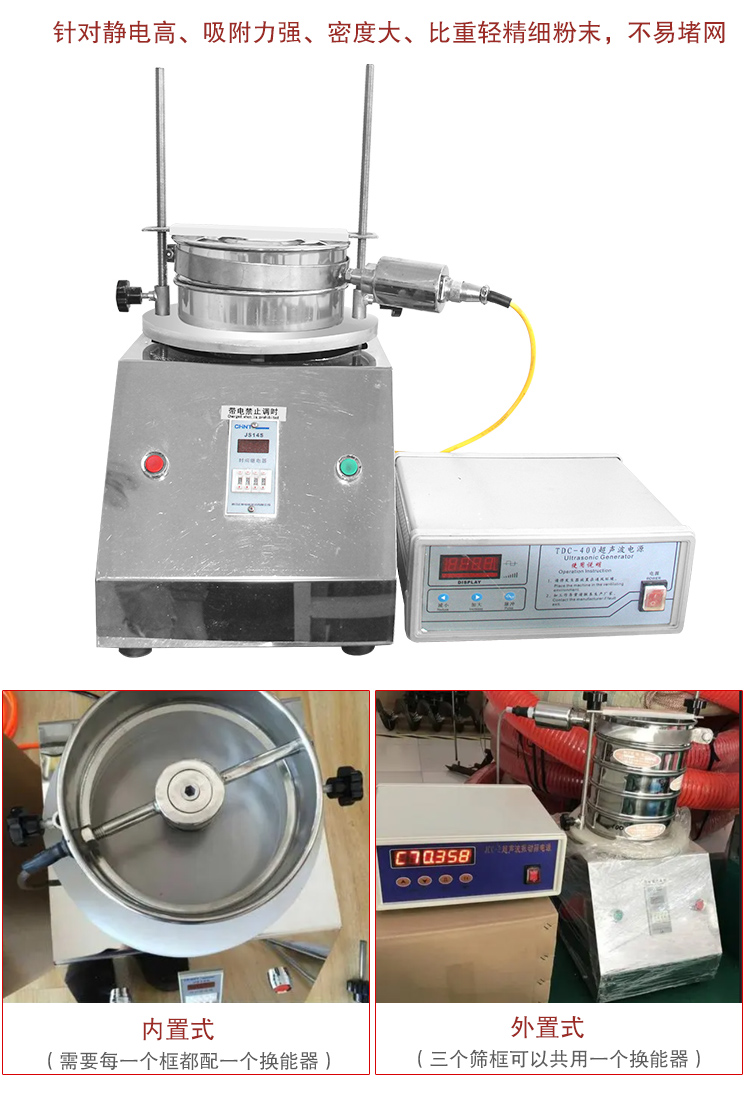 在標準檢驗篩基礎上增加了超聲波篩分系統(tǒng),解決了篩分200目以上高目數(shù)產(chǎn)品或普通檢驗篩難以篩分的易結(jié)塊、易帶靜電的產(chǎn)品的難題,并防止篩網(wǎng)堵塞。