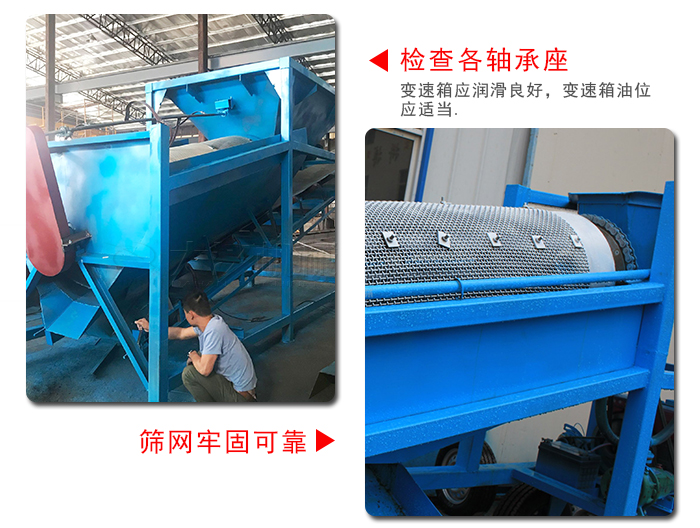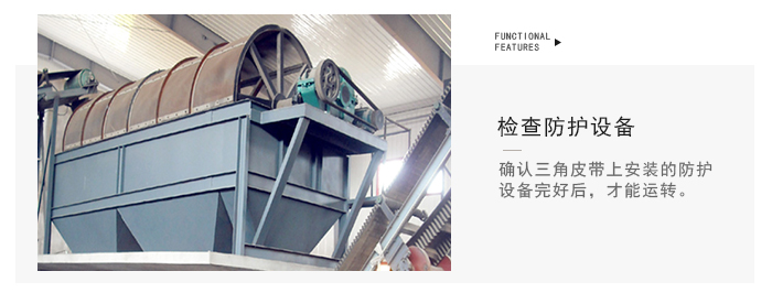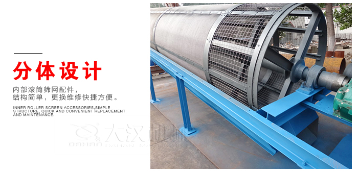 滾筒篩篩沙機(jī)主要由電機(jī)、減速機(jī)、滾筒裝置、機(jī)架、密封蓋、進(jìn)料口、出料口等部分組成。滾筒裝置傾斜安裝于機(jī)架上。電動(dòng)機(jī)經(jīng)減速機(jī)與滾筒裝置通過聯(lián)軸器連接在一起,驅(qū)動(dòng)滾筒裝置繞其軸線轉(zhuǎn)動(dòng)。當(dāng)物料進(jìn)入滾筒裝置后,由于滾筒裝置的傾斜與轉(zhuǎn)動(dòng),使篩面上的物料翻轉(zhuǎn)與滾動(dòng),使合格物料(篩下產(chǎn)品)經(jīng)滾筒后端底部的出料口排出,不合格的物料(篩上產(chǎn)品)經(jīng)滾筒尾部的排料口排出。由于物料在滾筒內(nèi)的翻轉(zhuǎn)、滾動(dòng),使卡在篩孔中的物料可被彈出,防止篩孔堵塞。